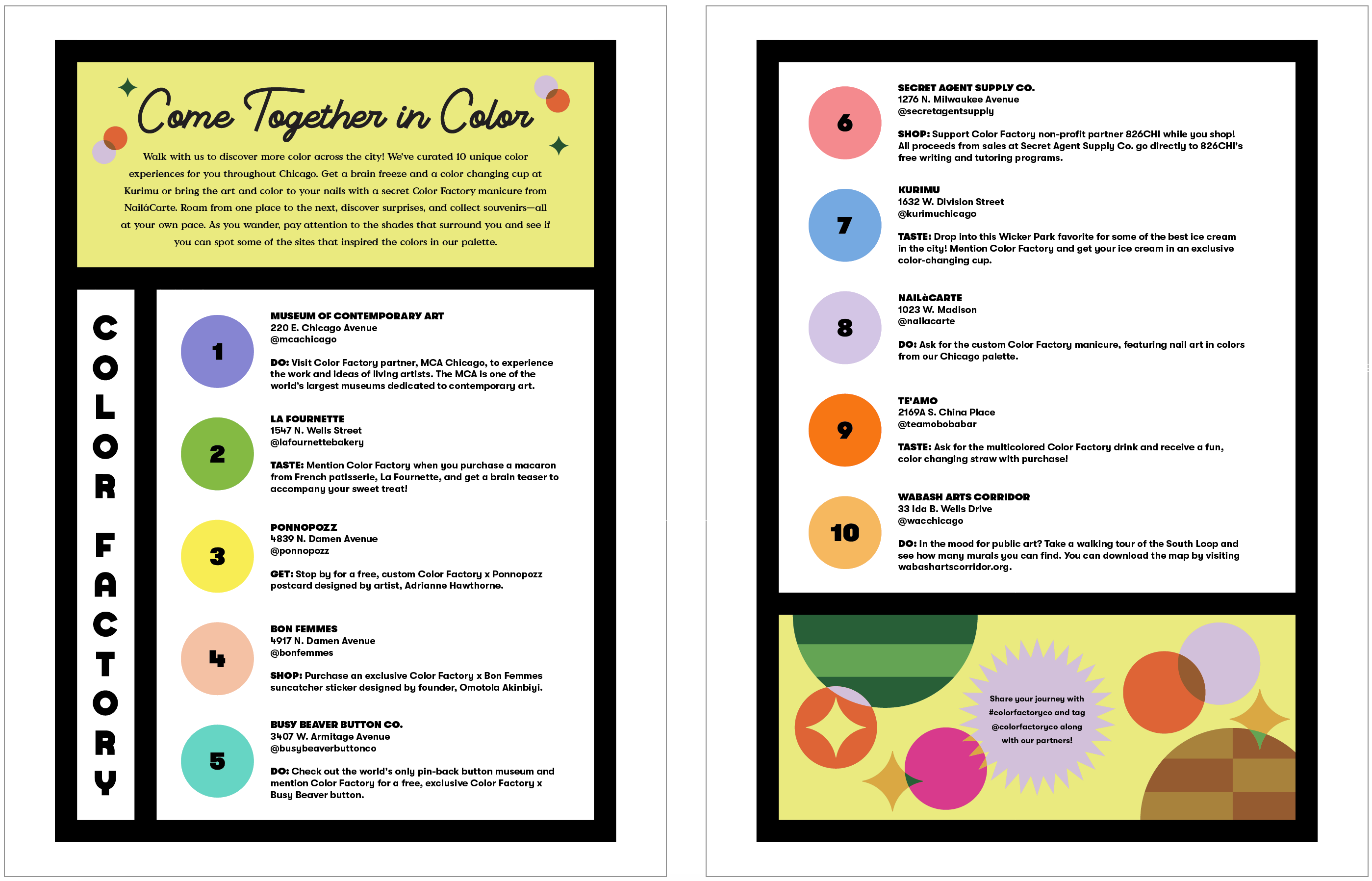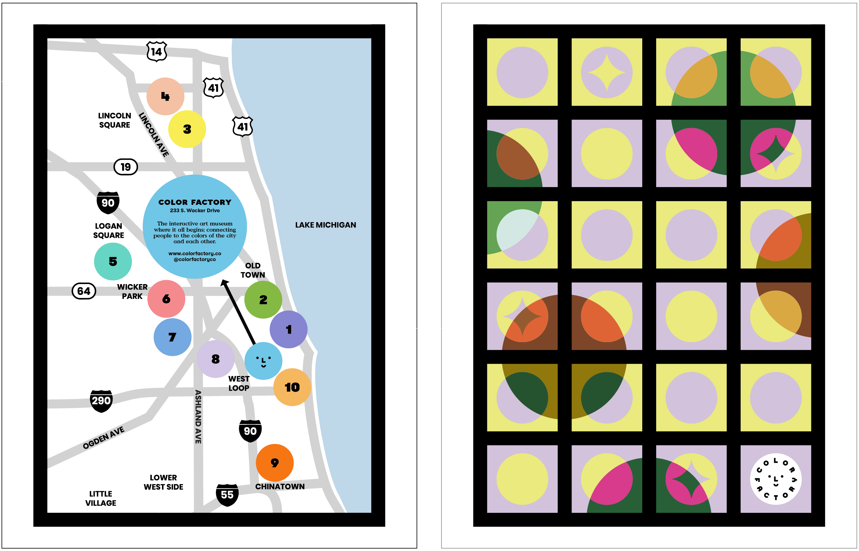 Additionally, I designed a limited-edition Color Factory NYC Neighborhood Map featuring seasonal partnerships with several local businesses. The newsprint map was an effort to highlight the surrounding neighborhood offerings, some of which provided free gifts or treats to map holders.